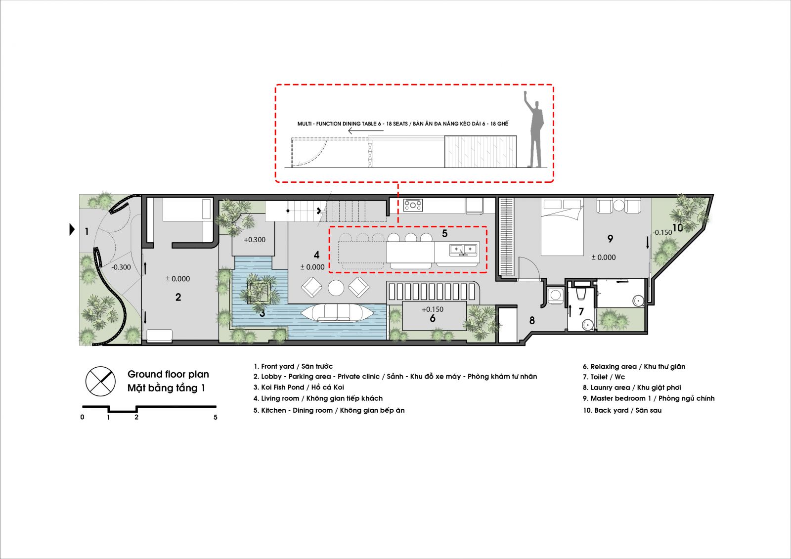 - Hồ cá và sân vườn lòng ghép vào không gian sinh hoạt chung: Với diện tích hạn chế của khu đất nhưng chủ nhà có số lượng lớn cây xanh cũng như nhu cầu nuôi cá Koi, nên KTS đã lòng ghép các không gian lại với nhau thành một không gian chung. Hồ cá bên cạnh vai trò tạo cảnh quan còn giúp cải thiện vi khí hậu cho ngôi nhà.